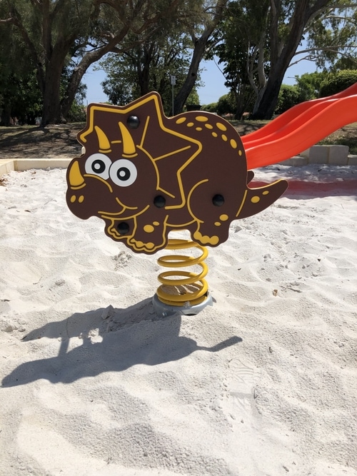 Playmster were asked to replace the ageing small playground and swings. We used the mature trees surrounding the playground area as inspiration for our Rustic Range. The timber panels and weathered copper posts blending with the natural foliage, the bright orange and green components ensuring our playground stood out. Irregular limestone walls by Al's Limestone adds instant interest and another balancing element to the area. The cute, smiling Triceratops rocker in the centre of the pit promotes the idea that playgrounds are fun.